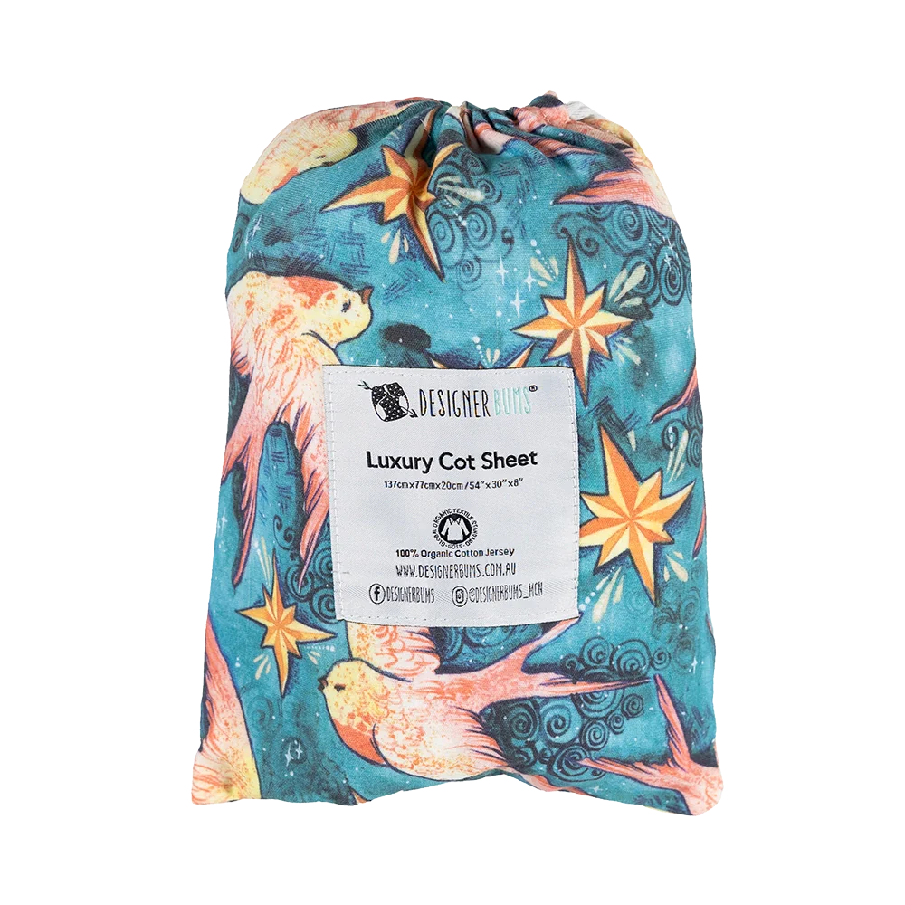 Made for sweet dreams! Designer Bums Luxury Cot sheets are not only made with premium, natural fabrics and featuring stunning exclusive artwork, but they are also incredibly versatile. A generous size of 137cm x 77cm x 20cm (54”x 30”x 8”) and made from 100% GOTS certified organic cotton jersey manufactured to OEKO-TEX Standard 100 to ensure the exclusion of harmful ingredients meaning they are safe for your baby's precious skin and kind to the environment. Tested on a wide range of cot mattresses and fit comfortably over round and oval options, simply tuck the corners under. Breathable and so cosy, our beautifully designed cot sheets are incredibly comfortable to sleep on in warmer or cool conditions. Style your nursery with our wide range of unique and exclusive designer prints to suit any theme and aesthetic.
