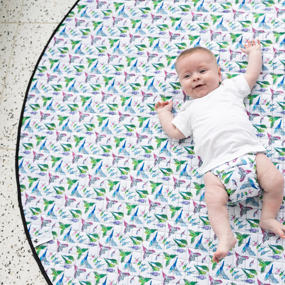 Designer Bums Play Mats feature a reversible design with a soft bamboo velour side for comfort and warmth, and a water-resistant PUL side finished in our signature prints. This allows the mat to transition easily from living spaces to outdoor settings such as parks or backyards.