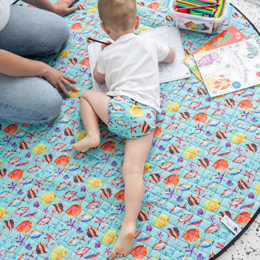 Our Premium Play Mats are designed for everyday family life, both at home and on the go. They’re perfect for tummy time and floor play indoors, and just as practical for outdoor use at the park, beach, backyard or while travelling. Lightweight and easy to fold, play mats can be packed into a Tote Wet Bag alongside towels, spare clothes, snacks and other essentials, making them ideal for family outings and day trips.