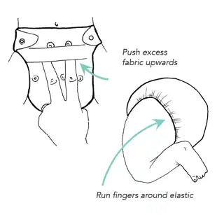 Check that you can fit two fingers in the waist band to ensure it is not too tight and allows space for when the baby is sitting up and make sure the leg and back elastics are not digging or uncomfortable.